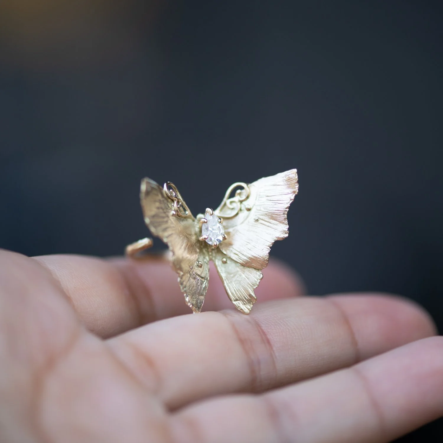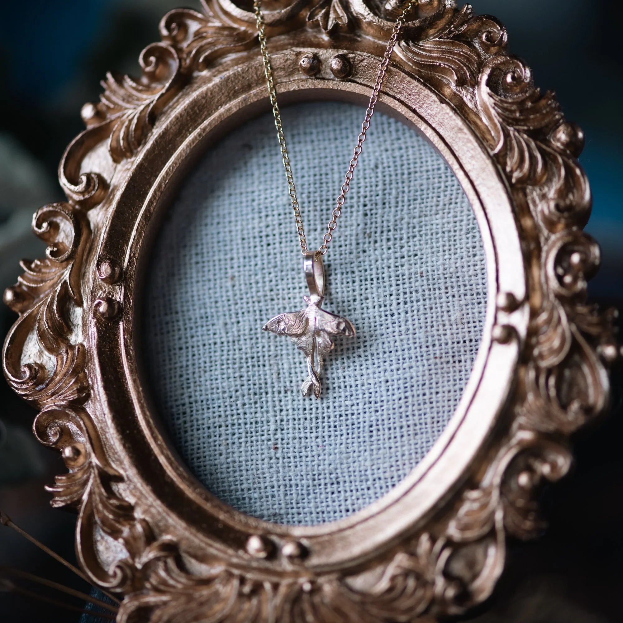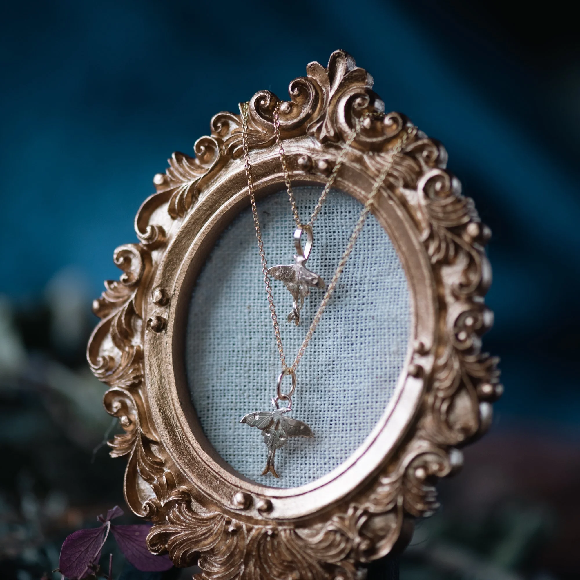 One is a young moth, with full scrollwork antennae and intact wings, and a white opal. The other is an old moth, decaying, with broken antennae and tattered wings. It's opal is black.